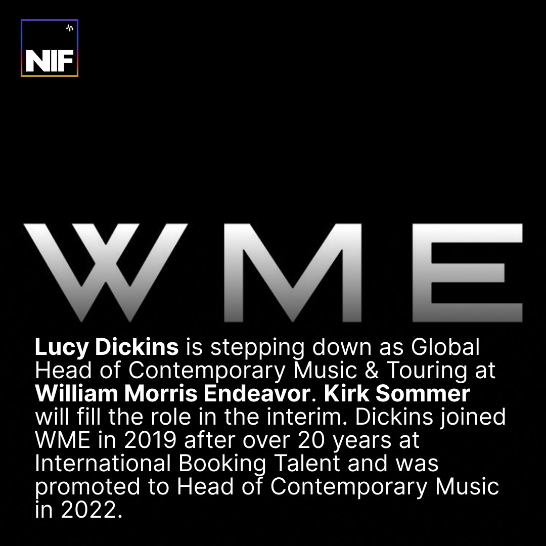 Lucy Dickins is leaving her role as Global Head of Contemporary Music & Touring at WME, with Kirk Sommer taking over in the interim.