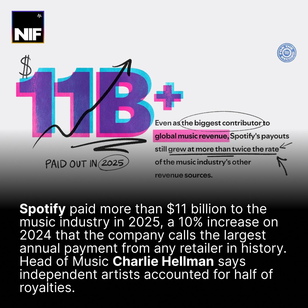 Spotify paid over $11B to the music industry in 2025. With independent artists earning half of all royalties.